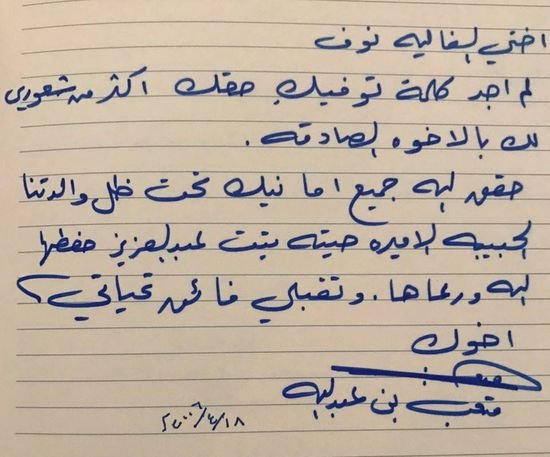نشرت صورة مصاحبة للتغريدة لرسالة قديمة خطّها متعب بن عبد الله بيده، ووجهها لها في العام 2006.