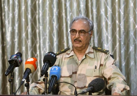 وكان حفتر قد عقد أمس لقاء موسعا بمشايخ وأعيان ونشطاء برقة وعمداء بلدياتها إضافة إلى عدد من النواب وأعضاء الحكومة المؤقتة أكد فيه أن .التحام أبناء الشعب الليبي بجيشه الذي يخوض حربا ضد الإرهاب هو الداعم الرئيسى للجيش الذي سينتصر في هذه المعركة, مشيرا إلى أن الجيش لا يتدخل في السياسية لكنه لن ينتظر حتى تحظر عنه الأسلحة ويقف متفرجا أمام الإرهابيين الذين عاثوا في الأرض فسادا, وقال إن المادة الثامنة من الاتفاق السياسي تقف حجر عثرة أمام تسليح الجيش.