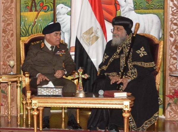 زار الفريق أول صدقى صبحى القائد العام للقوات المسلحة وزير الدفاع والإنتاج الحربى يرافقه الفريق محمد فريد رئيس أركان حرب القوات المسلحة الكاتدرائية المرقسية بالعباسية لتقديم التهنئة لقداسة البابا تواضروس الثانى بابا الإسكندرية الكرازة المرقسية بمناسبة الإحتفال بعيد الميلاد المجيد .