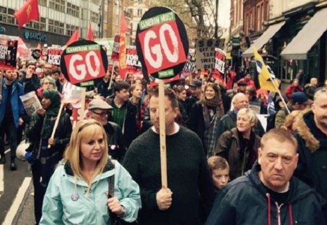 وندد المتظاهرون بالتخفيضات في التقديمات الاجتماعية وبسياسات التقشف التي يتبعها ديفيد كاميرون ووزير ماليته جورج أوزبورن منذ عام 2010، ملوحين بلافتات كتب عليها "يجب أن يرحل"، في إشارة إلى رئيس الوزراء.