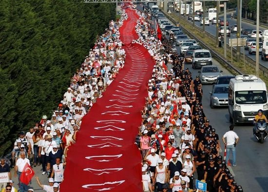 ويصف المراسل منظر حشود طويلة من المتظاهرين امتدت على مسافة نحو كيلومترين يقودها زعيم حزب الشعب الجمهوري المعارض، كمال كليجدارأوغلو، في ما عرف بمسيرة العدالة.