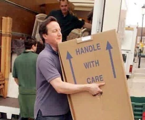 تداول مستخدمو مواقع التواصل الاجتماعي صورة لرئيس الوزراء البريطاني السابق ديفيد كاميرون أثناء نقله أغراضه من مقر إقامته السابق إلى منزله الجديد.