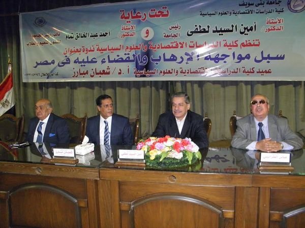 أشار الدكتور شعبان مبارز عميد كلية الاقتصاد والعلوم السياسية الى أن أهداف الندوة الوصول إلى إيجاد سبل لمكافحة الإرهاب في مصر من خلال توصيات تساعد الدولة في إيجاد هذه السبل للقضاء عليه في مصر وكذلك الإجابة على الأسئلة التي تدور بالأذهان حول كيفية إيجاد سبل لتلك المواجهة كالشريط الحدودي الأمني في رفح والقضاء على التمويل وبتره كذراع تمتد لمساعدة الإرهاب وكذلك الحالة الأمنية لتوجيه ضربات استباقية لهذا الإرهاب مع ضرورة سرعة إصدار الأحكام القضائية الرادعة في هذا المجال